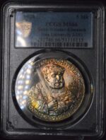 Mintage was limited to only 40,000 pieces, and high-grade survivors are scarce—especially in pristine condition. The piece you referenced, graded PCGS MS66, ranks among the highest-known examples, signifying nearly perfect luster, minimal marks, and exceptional eye appeal. The addition of rainbow or pastel toning—caused by long-term natural oxidation of the silver surface—makes such coins particularly prized, as each toned pattern is unique. Collectors place strong aesthetic premiums on these coins, especially when the color is even and vivid.​