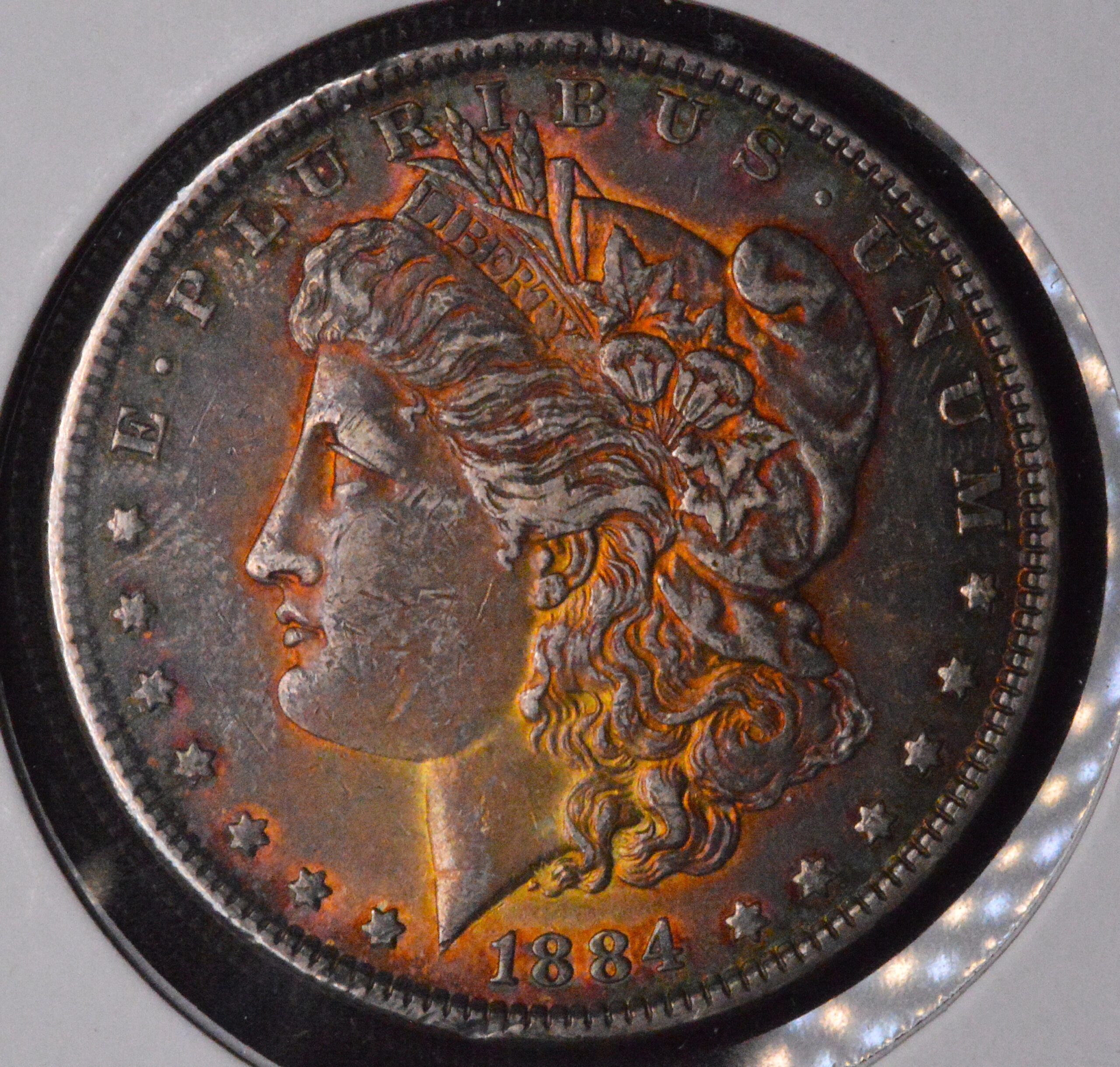 The 1884-P is plentiful in circulated and uncirculated grades due to its high original mintage of over 14 million coins. However, coins with exceptional radiant toning—especially with vivid orange hues—are far scarcer and command notable premiums at auction. Mint State examples (MS64 and higher) with monster toning can realize several times the price of a typical untoned piece, depending on overall eye appeal and market demand.