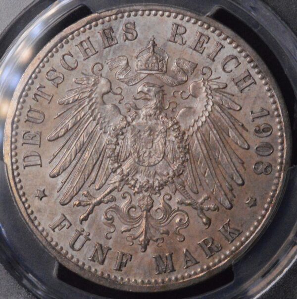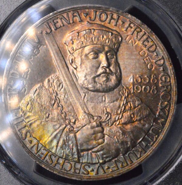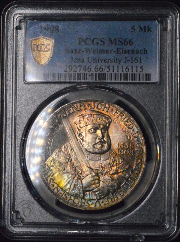 In short, the 1908 Saxe-Weimar 5 Mark Jena University coin in PCGS MS66 with rare rainbow pastel toning represents one of the finest examples of early 20th-century German silver commemoratives. Its combination of low mintage, artistic design, historical significance, high grade, and vivid coloration makes it a true trophy coin for Empire-era collectors.