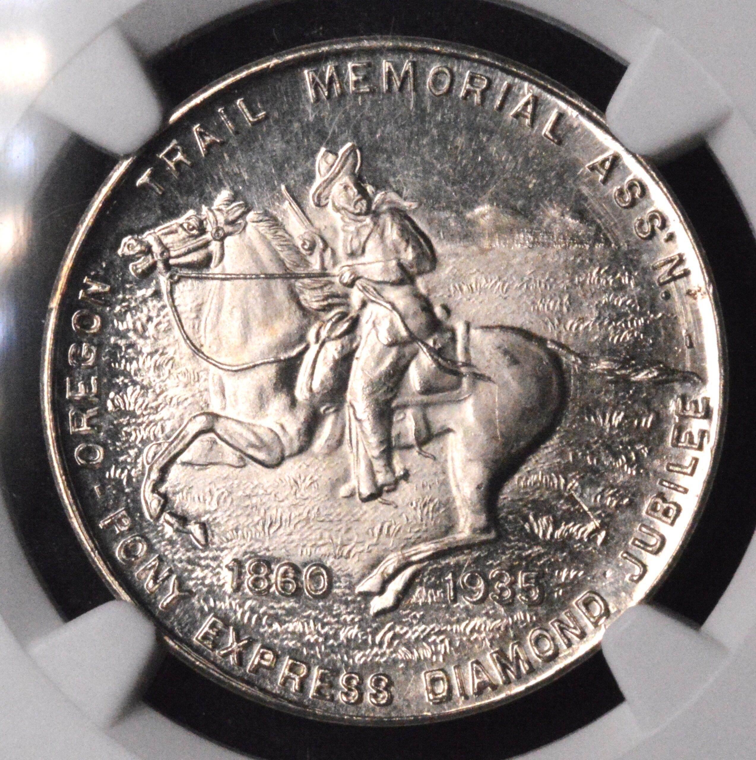 The medal’s status as a Diamond Jubilee commemorative adds further historical depth, making it a notable piece for collections focused on American postal history, western expansion, or unusual non-circulating coins and medals. The combination of rarity, captivating design, and high grade make the 1947 Pony Express White Metal Commemorative Medal a highlight among so-called half dollars and American medals.