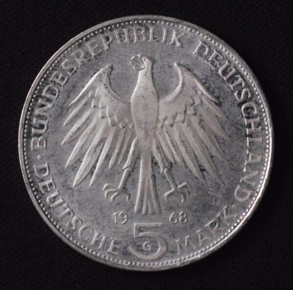 The 1968 Germany 5 Marks silver coin is a notable and collectible piece from the Federal Republic of Germany (FRG). Struck in 0.625 fine silver, the coin weighs 11.2 grams with a diameter of 29 mm, making it a substantial and attractive silver coin for collectors and investors alike.