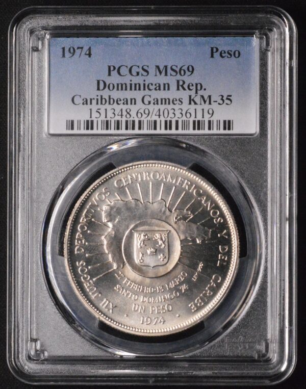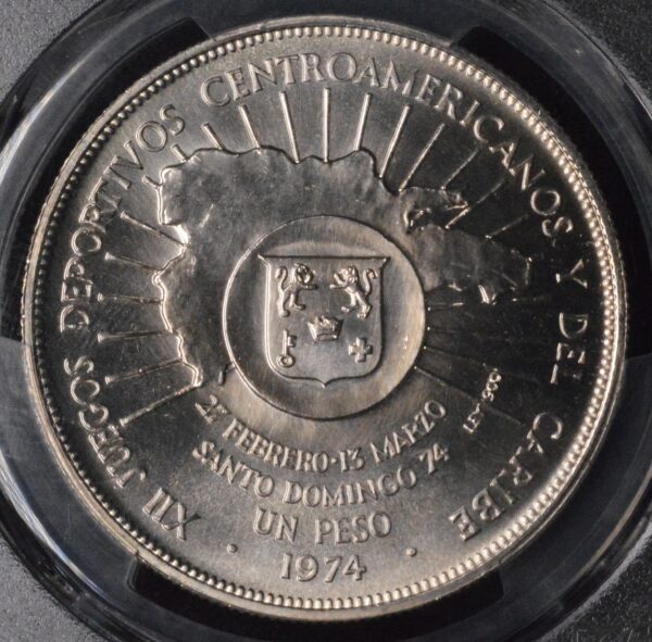 The 1974 Dominican Republic Silver Peso, KM# 35, was issued to commemorate the 12th Central American and Caribbean Games. This non-circulating coin is struck in 90% silver, weighs 26.7 grams (with an actual silver weight of approximately 0.77 troy ounces), and has a diameter of 38 mm.