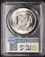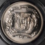 The obverse of the coin shows the Dominican Republic’s national coat of arms without any memorial legend, while the reverse features the coat of arms within a circular motif placed atop a map, marking the event and denominating the coin as “UN PESO.” The coin was produced in Brilliant Uncirculated and Proof finishes, with a reported mintage of 5,000 coins for collectors.