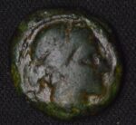 ​The obverse of this bronze coin typically depicts the wreathed head of Kore (Persephone), a significant figure in Greek mythology known as the goddess of spring and the underworld. The detailed portrait, though often small, is striking, and is accompanied by a graceful diadem or wreath of grain ears to emphasize her role as a fertility deity.