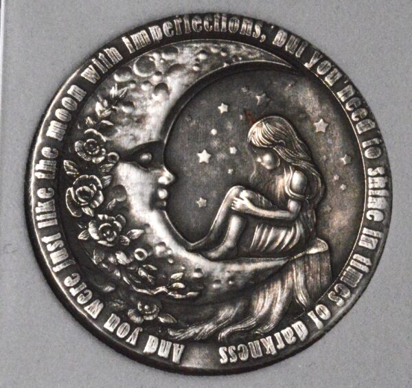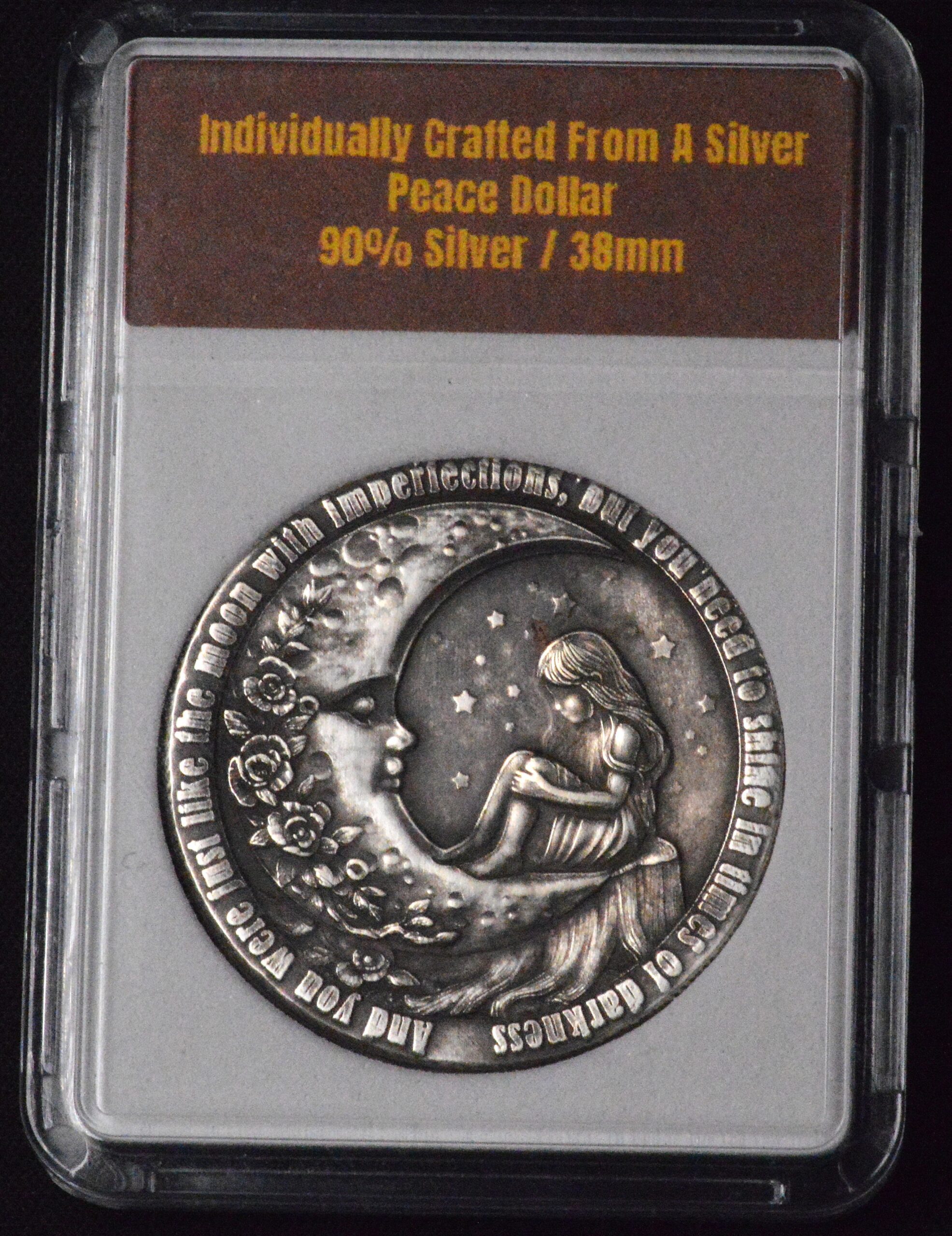 In summary, this Peace Dollar engraved with a “Girl in front of the Man of the Moon” is a stunning, high-detail example of custom hobo art. It represents a rare artistic transformation of historic silver coinage into a unique collectible piece cherished by enthusiasts of both coin collecting and fine engraving arts.