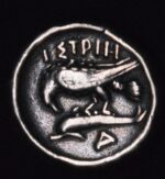 On the reverse, the coin displays an eagle perched on a dolphin, a powerful combination symbolizing strength, divine power (often linked to Zeus), and maritime prowess. The eagle represents the city’s military might and divine favor, while the dolphin symbolizes the sea and navigation, highlighting Istros’s reliance on maritime trade and its strategic position. This imagery conveyed the city’s political authority and cultural significance in the ancient Greek and Black Sea worlds.