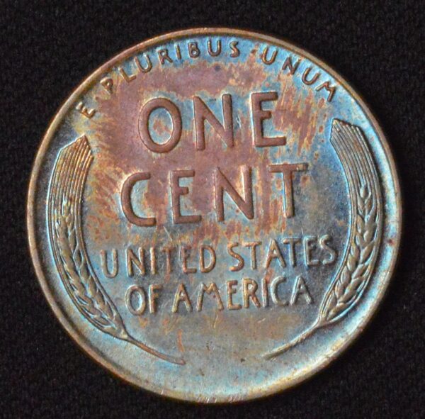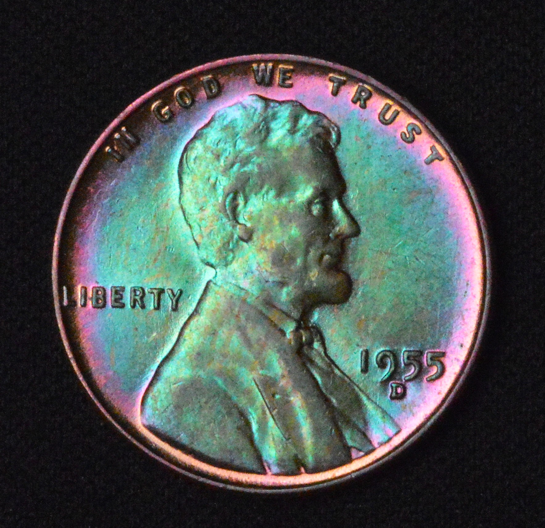 While the 1955-D was mass-produced (over 563 million coins), high-grade examples (“MS” grade) with monster toning from mint sets sell at a premium. Recent sales show toned MS63 coins fetching up to $50 or more, with extraordinary specimens in MS66–MS67 sometimes selling for hundreds due to color and eye appeal. Toning does not affect the underlying mint state, and top-graded coins with intense original color are prized showcase pieces for wheat cent collectors and enthusiasts of U.S. numismatic toners.