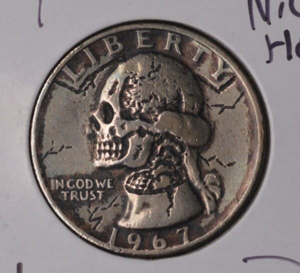 The “RIP Skull of George Washington” hand-made hobo quarter is a distinctive piece of folk art where the familiar profile on the Washington quarter is artistically transformed into a skull motif. This hand-carved design belongs to the tradition of hobo nickels and hobo quarters, where skilled artists carve coins into miniature works of art using intricate details and symbolism. The skull theme on George Washington’s portrait offers a striking and edgy reinterpretation of the iconic U.S. quarter, blending historical Americana with a modern, gothic twist.