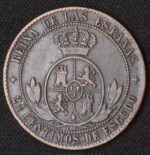 The obverse of the coin features the laureate head of Queen Isabel II facing right, surrounded by a beaded circle and legend. The reverse displays a crowned oval coat of arms above sprigs, again set within a beaded circle. Typical of coins issued under Isabel II, the design reflects the monarchy’s symbolism and Spain’s artistic traditions at the time.